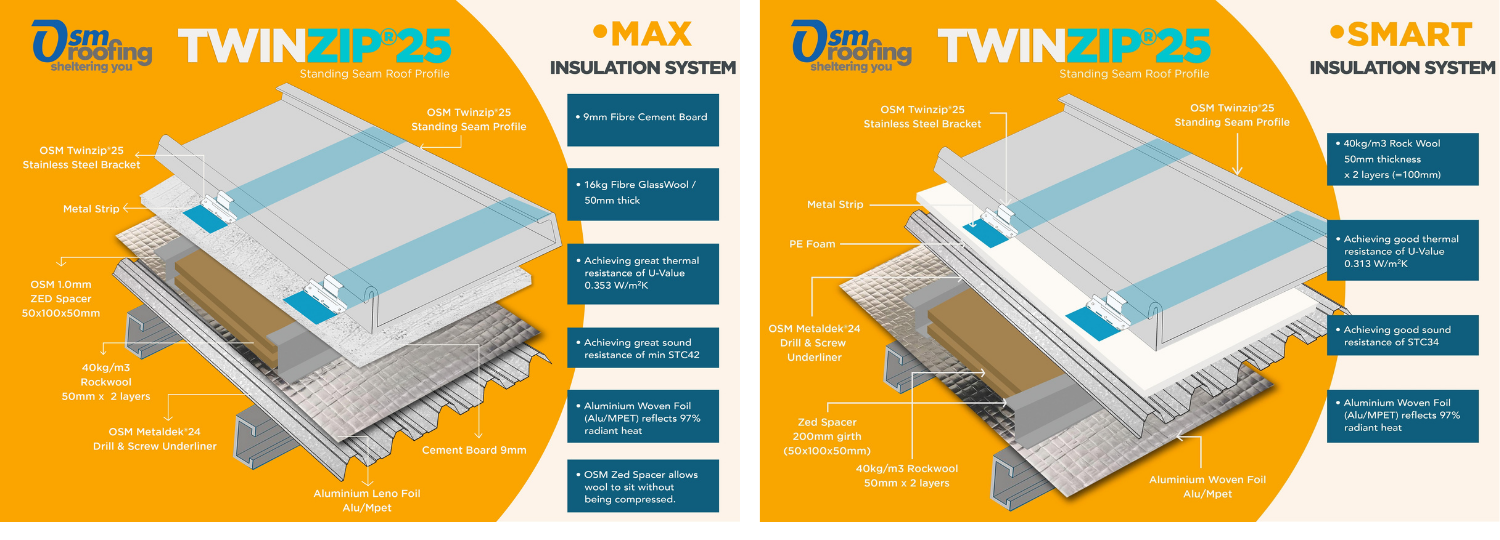 Introducing Twinzip®25 - a cutting-edge full interlocking roof system with a double lock design. In this standing seam metal roof system, the edges of adjacent sheets are intricately turned up and interlocked using stainless steel clips, securely fastened to the roof supports. This unique design ensures a weather-tight unit without any exposed rivets or screws on the surface.